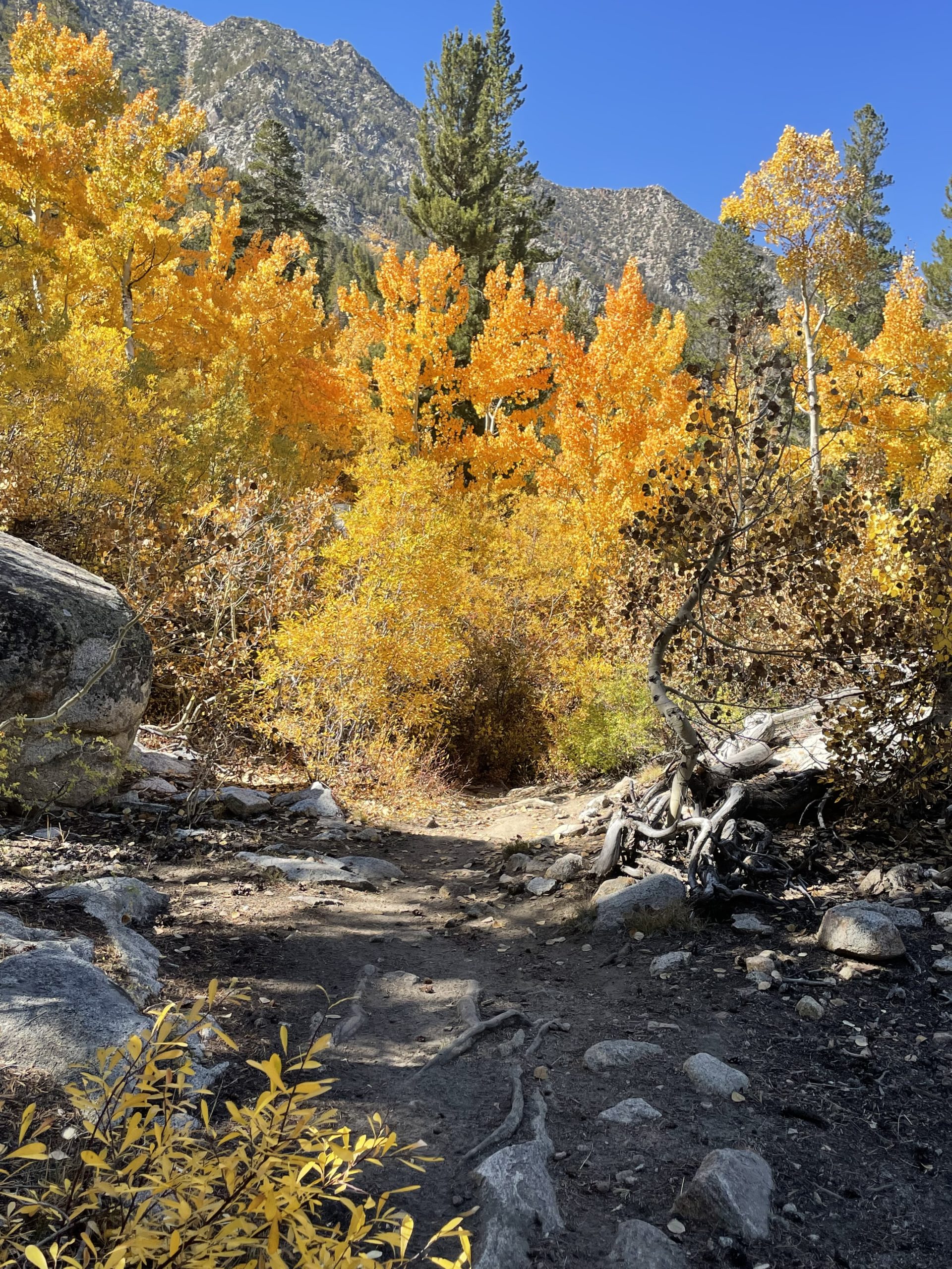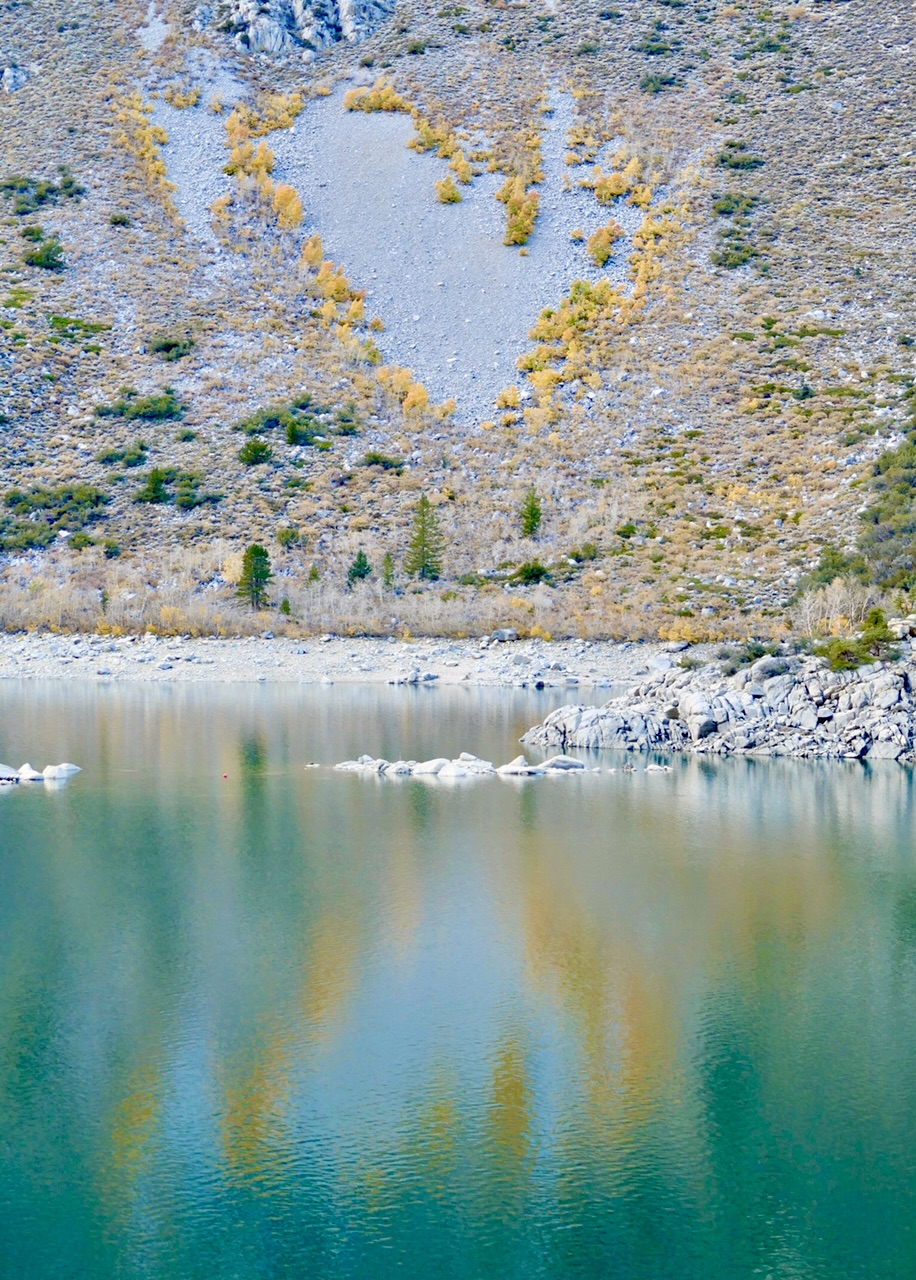 Our autumnal stays grew from four days to a full, glorious two weeks this year, and had work demands not pressured us to return to city life, there would have been another full week of vividly hued adventures. The color display starts at the higher elevations, prompted by dropping temperatures and fading hours of sunlight. When we arrived, the aspen trees around our cabin, at 8,500’, were still green, but the hillsides around South Lake, at almost 10,000’, were aflame. We hiked high for the first few days, discovering trails disappearing into golden tunnels, and before we left we found a heart of brilliant aspens growing above Lake Sabrina.
