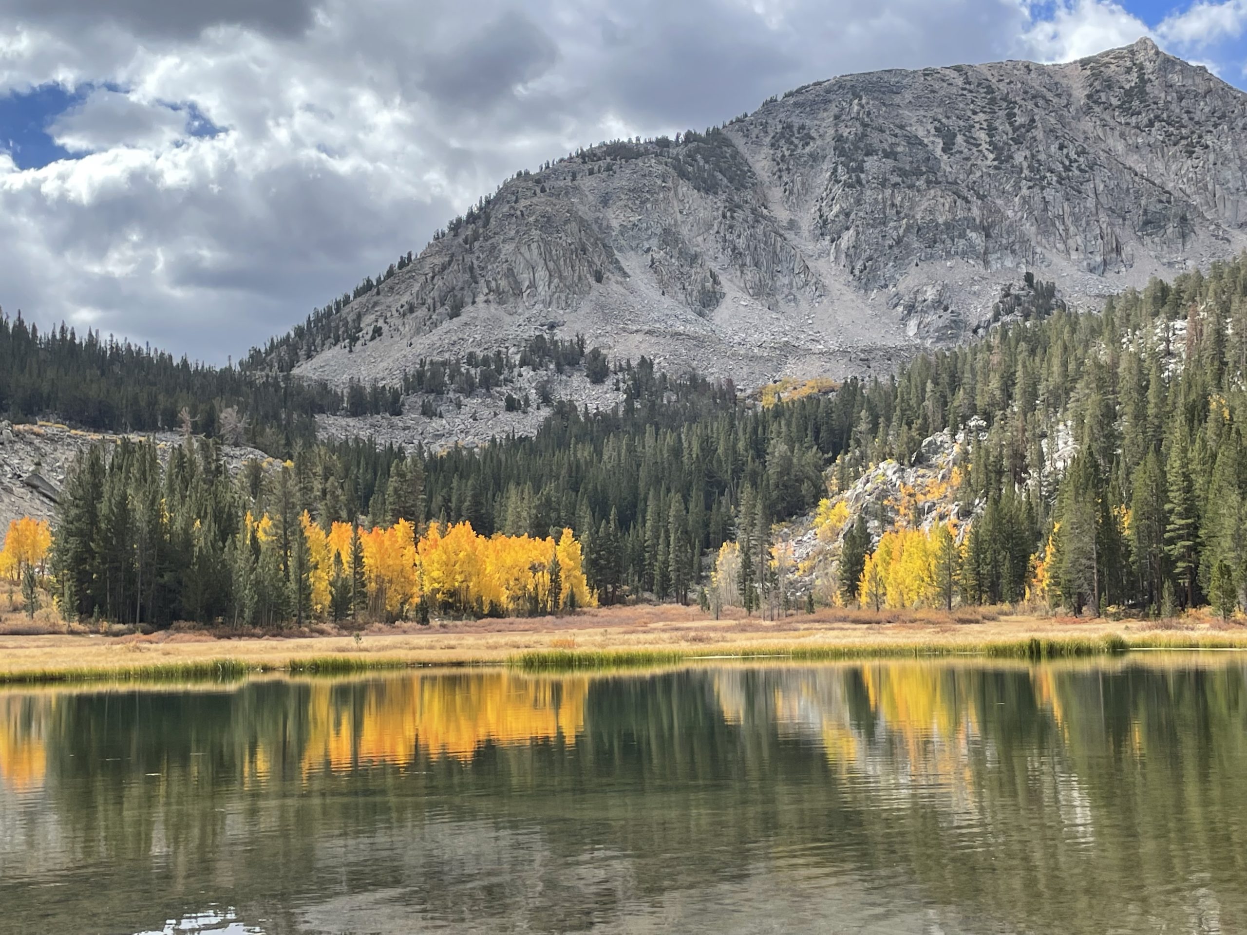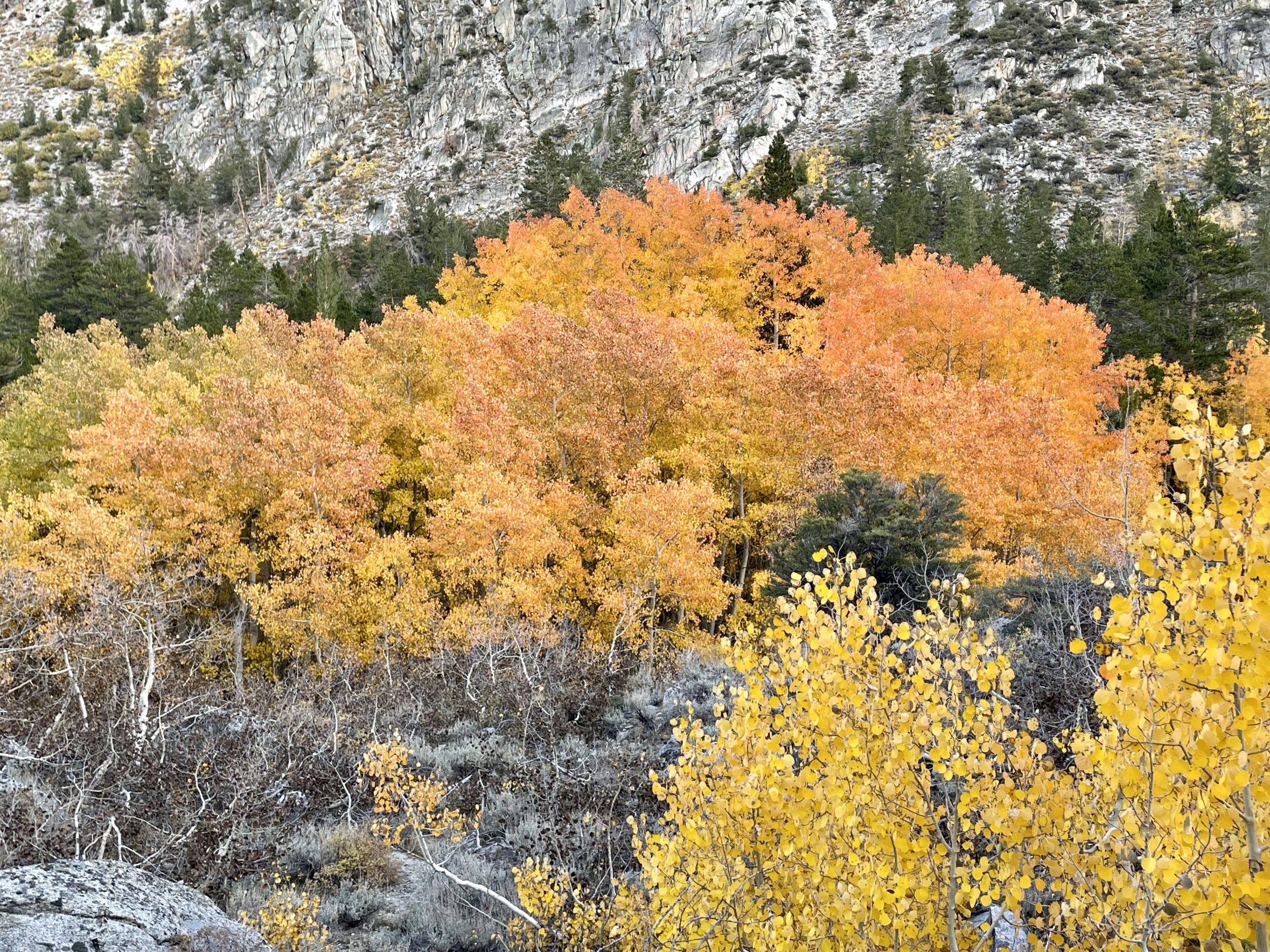 The east side of the Sierra reliably displays an explosion of color during the first two weeks of October. After moving to Los Angeles from Vermont, and New York before that, each October I’d be filled with a deep seeded longing for the cool weather, vibrant leaves, clouds and winds of an east coast autumn. I’d visit Vermont when I could, until Steve and I discovered the mountains above Bishop, California. At first our hiking trips were all during the warm summers, but after a few years, I decided we needed to at least experience the cooler temperatures of October in the nearby mountains. I wasn’t expecting the grand show of yellows, golds and oranges the aspen trees put on.