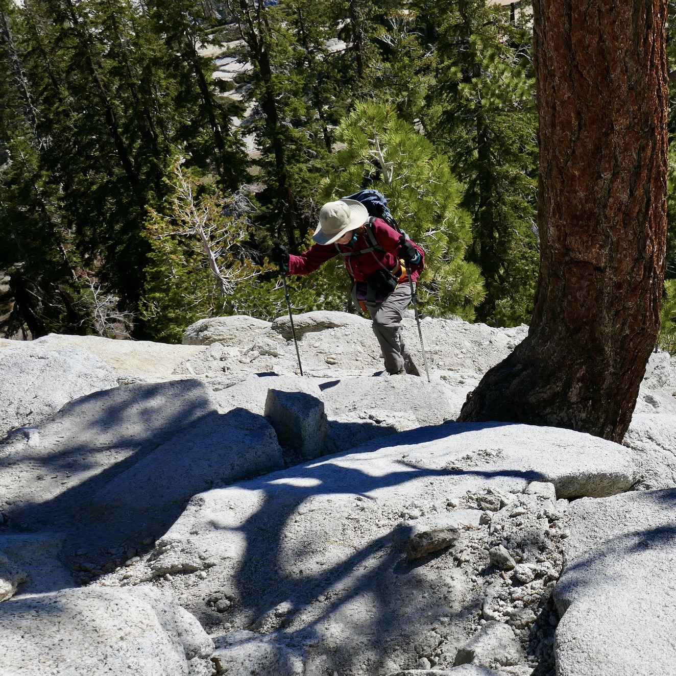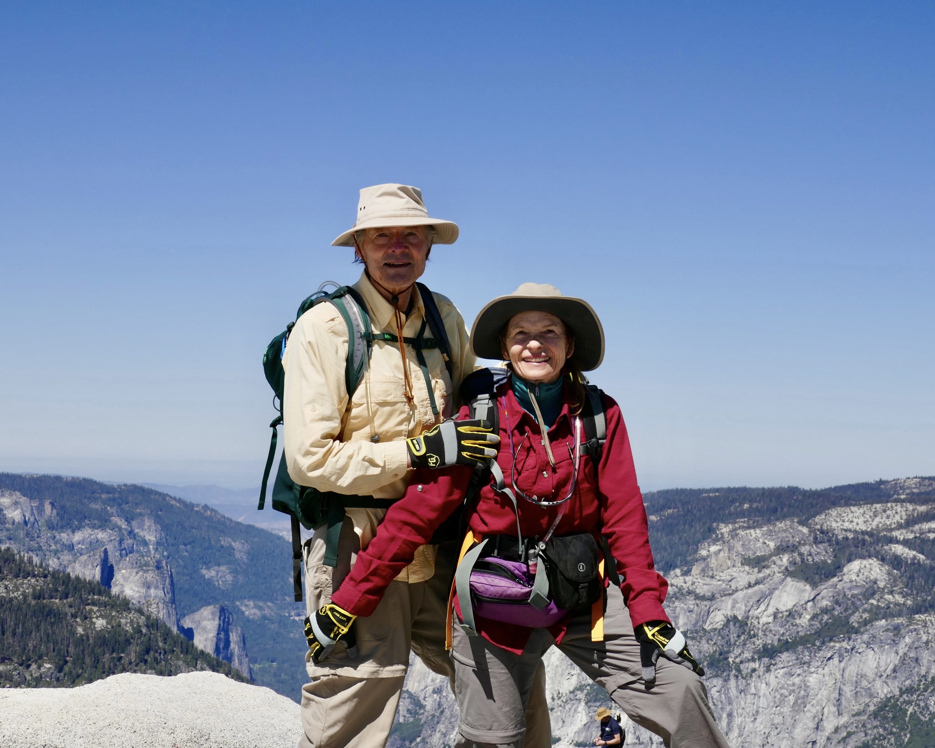 The alarm startled us awake at 4:30 am, we made coffee and tea, scarfed down breakfast in the dark, and then drove to the trailhead. We donned our packs, into which we had stuffed several last-minute items, increasing the carefully calibrated weight by a couple of pounds each. My knees wobbled, either from the burden I was carrying or in terror at what we were attempting. Were we crazy to think we could climb Half Dome at our age?