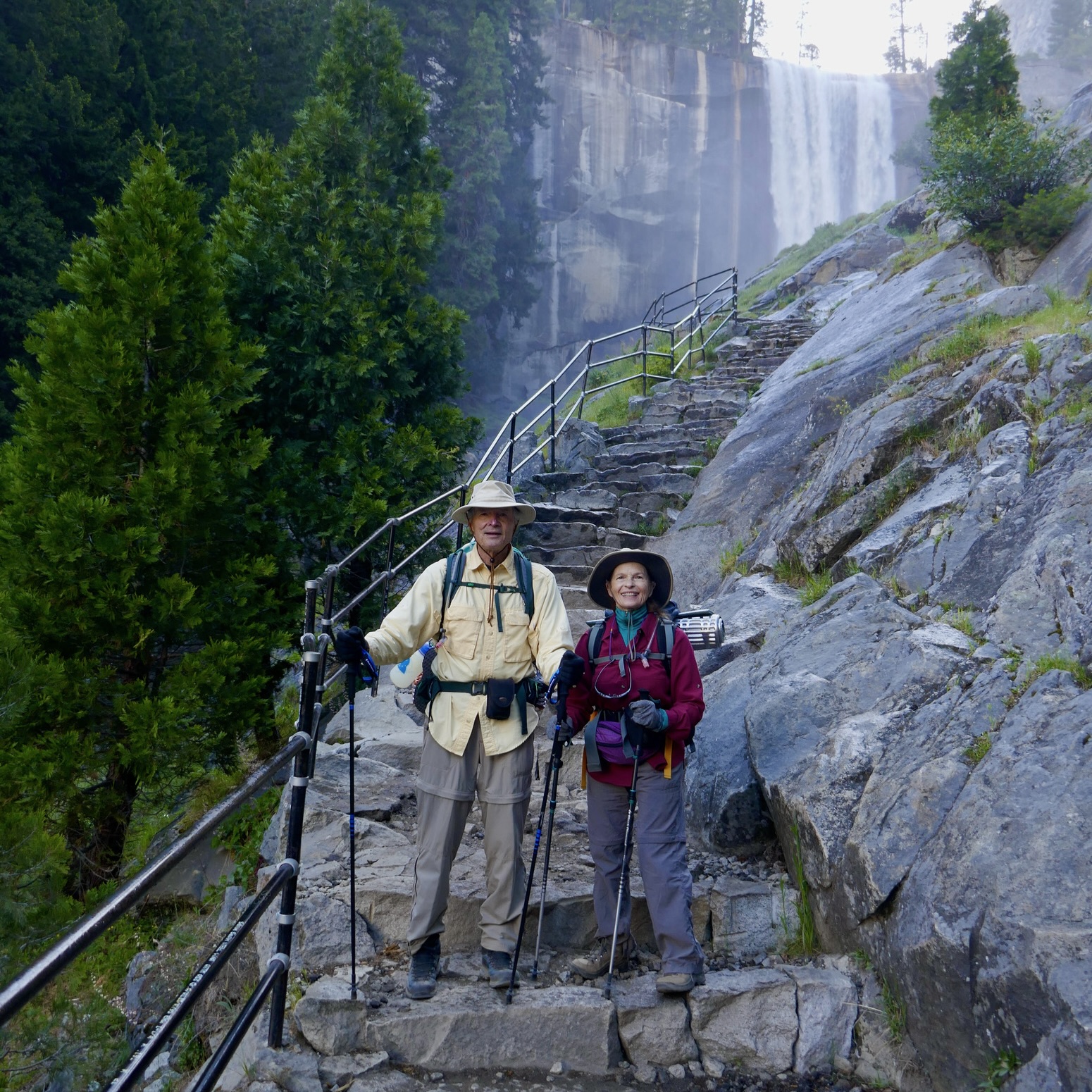 After hiking steadily uphill for 45 minutes, we heard the thunder of water from Vernal Falls pounding the rocks at it’s base. Even at the early hour, people gathered at the overlook bridge, awed by the beauty and power of the roaring water and the rainbows it created. This was the destination for many day hikers, but we climbed on. As we labored up the 600 steep, granite steps of the famous Mist Trail, clambering practically under the falls, we were drenched by the spray. Upon reaching the top, we gasped at the spectacular view straight down the 317-foot torrent.