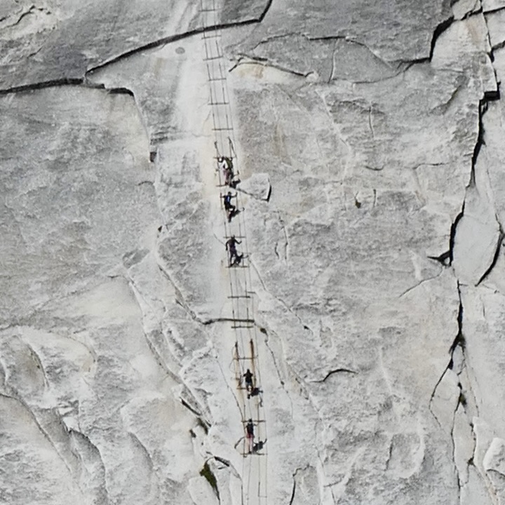 There was as much elevation gain ahead of us as we’d hiked the day before, culminating with an ascent to the 8,800’ summit. Two celebrated (or dreaded) metal cables stretch up the seemingly vertical granite slope to the top and make the final 400’ possible. As we grabbed onto those cables and jammed our feet into the rock for as good a grip as possible, we at first shuddered and then adrenalin took over and we climbed and scrambled upwards.