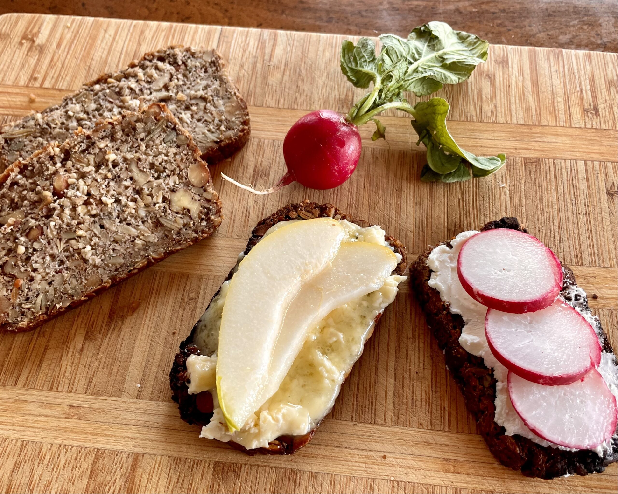 Good tasting, nutritious, gluten-free bread is so scarce, I spent many a day developing the recipe here. Nutrition would be especially important on this trip, and flavor and texture are always essential to pleasing food. This bread, I am proud to say, is loved by all who try it, whether they follow a gluten-free diet or not. It’s based on earthy buckwheat flour and hearty steel cut oats, it’s loaded with nuts and seeds, and flavored with tangy buttermilk and maple syrup. Flax seed, chia and hemp hearts round out the list of healthful ingredients. Like most gluten-free breads, toasting enhances the rich flavors.