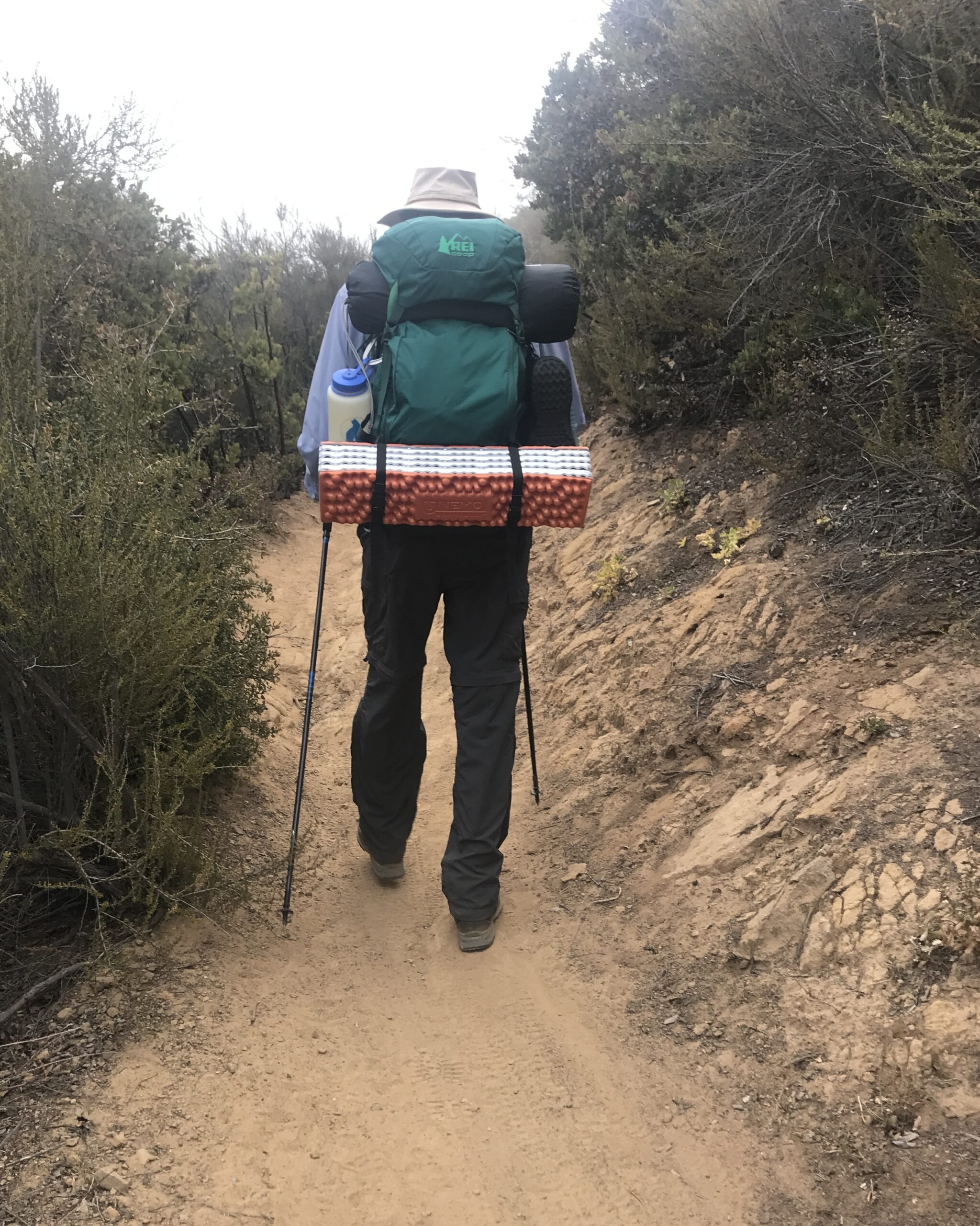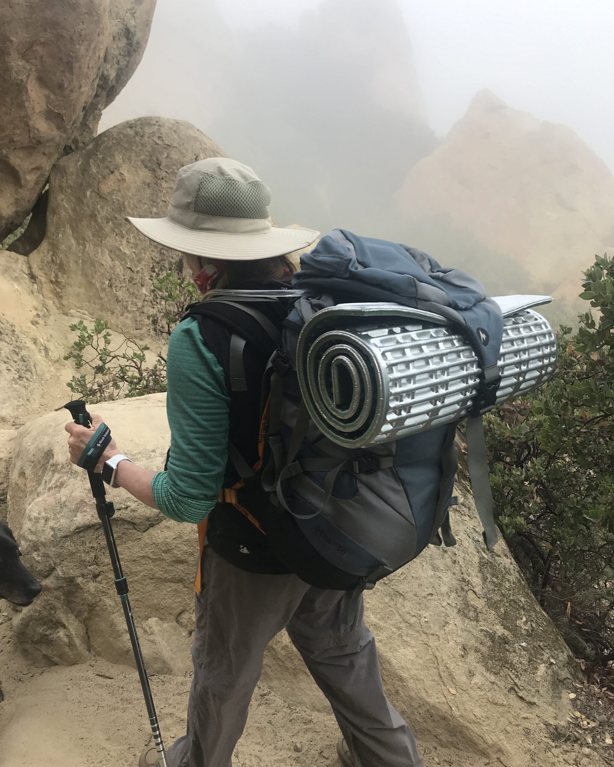 We devoted the next several months to conditioning and planning. The hike is 16 miles long, out and back, with an elevation gain of almost 5,000’. Most people make the trip in one very long day, either beginning or ending in the dark with the help of headlamps, but we were intimidated by that approach and so planned to cover the distance in two days. However, the tradeoff was we’d need to carry all the gear for camping overnight—not only food for two days on the trail, and larger packs, but also tent, sleeping bags, camp stove, water purifier, camelbacks filled with water, and sturdy gloves for grabbing the metal cables that make the final ascent possible. The list grew longer every time we thought about the trip because, after all, there is no store in the backcountry for forgotten necessities.