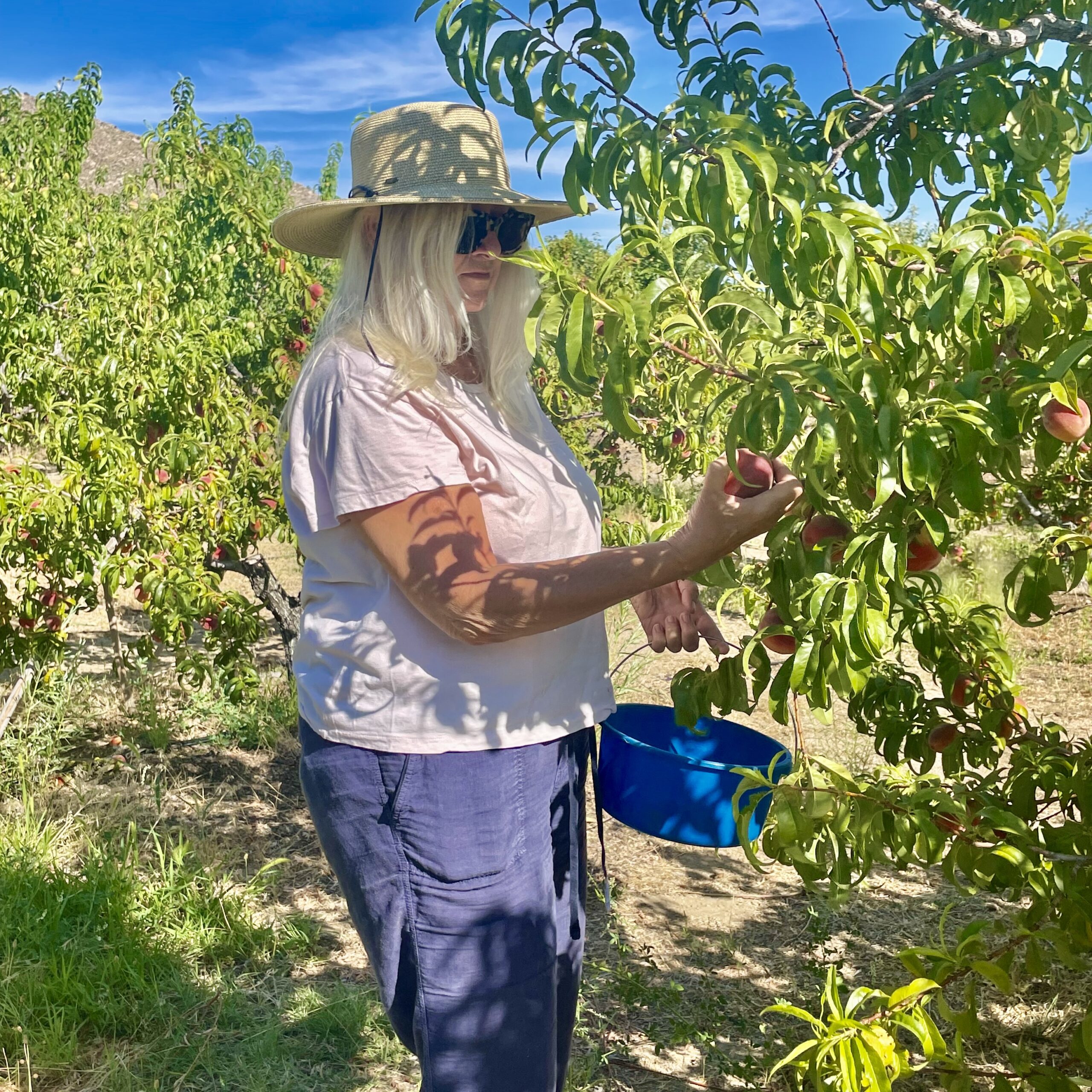 In the early days of our cabin life, we needed furnishings—tables, chairs, beds, pots and pans, flatware and dinner plates. Facebook Market Place quickly became my best friend. One morning, during what had become a breakfast ritual of checking out the new listings, a photo of bright red cherries still on the tree caught my eye. Always curious about food but thinking that most likely someone was selling the photo, I clicked on it. To my surprise, the description talked about an organic farm in Bishop. Being situated in the high desert, Bishop is hot and dry with a landscape that features mesquite and cactus. How could there possibly be a fruit farm? I had to go see for myself.
