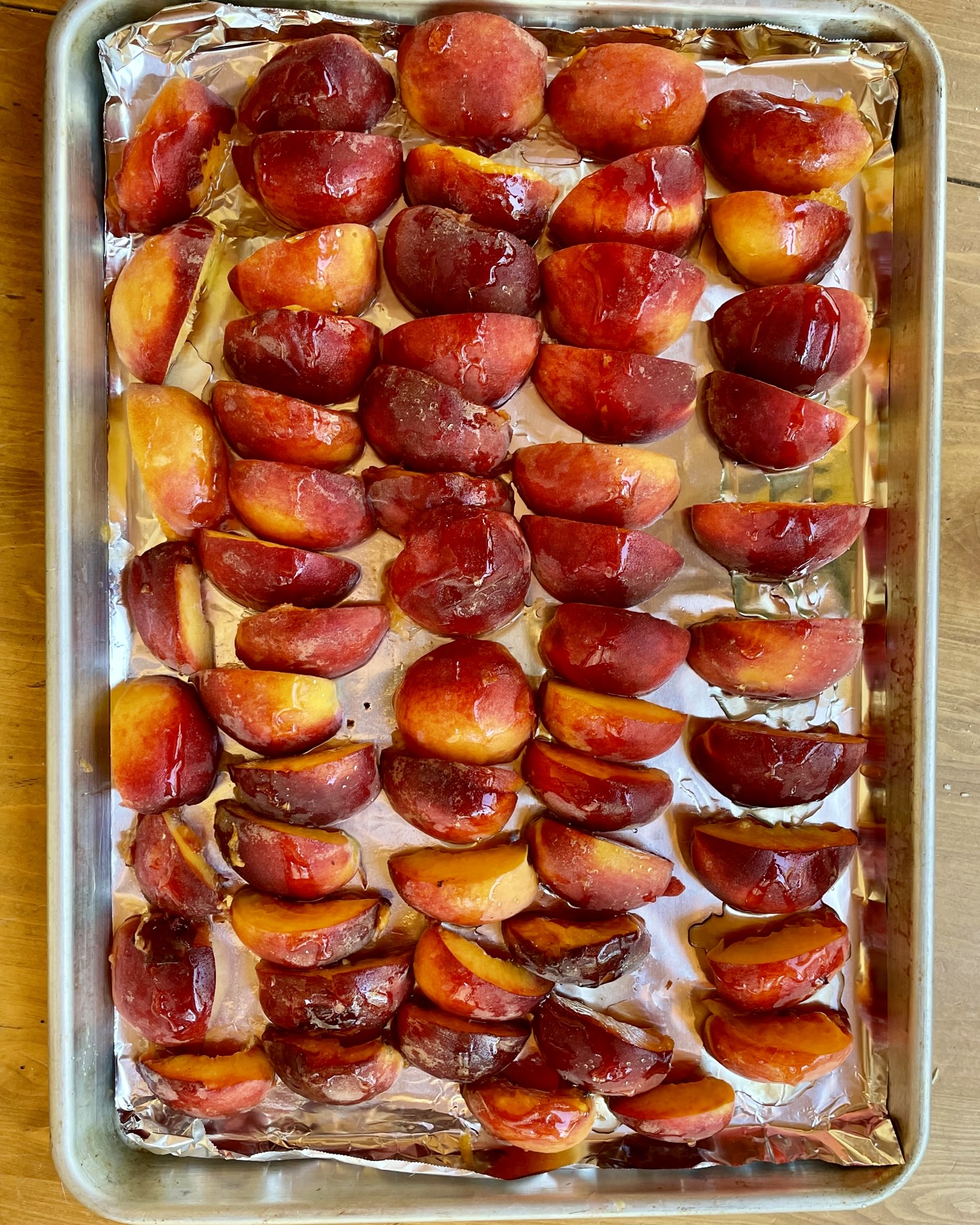 - Preheat the oven to 400℉. Line a heavy baking sheet or large pizza pan with foil. Arange the peach quarters on the parchment, skin side down. Drizzle with the honey and sprinkle with the brown sugar. Roast the peaches until almost tender, about about 25 minutes. Using a spoon, gently turn over the peaches. Continue roasting until very tender, about 15 minutes longer. Cool the peaches on the pan. Before they reach room temperature, loosen from the foil to prevent sticking.
